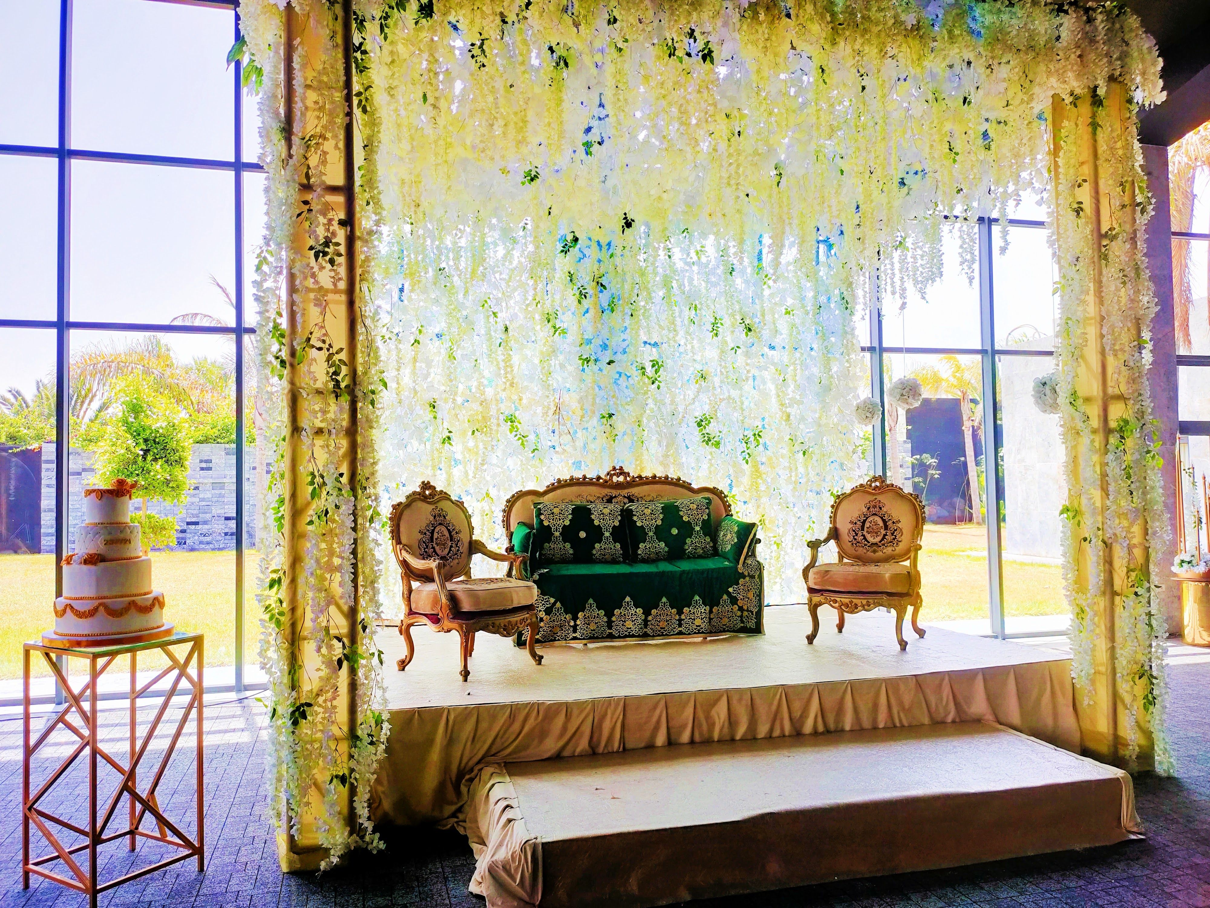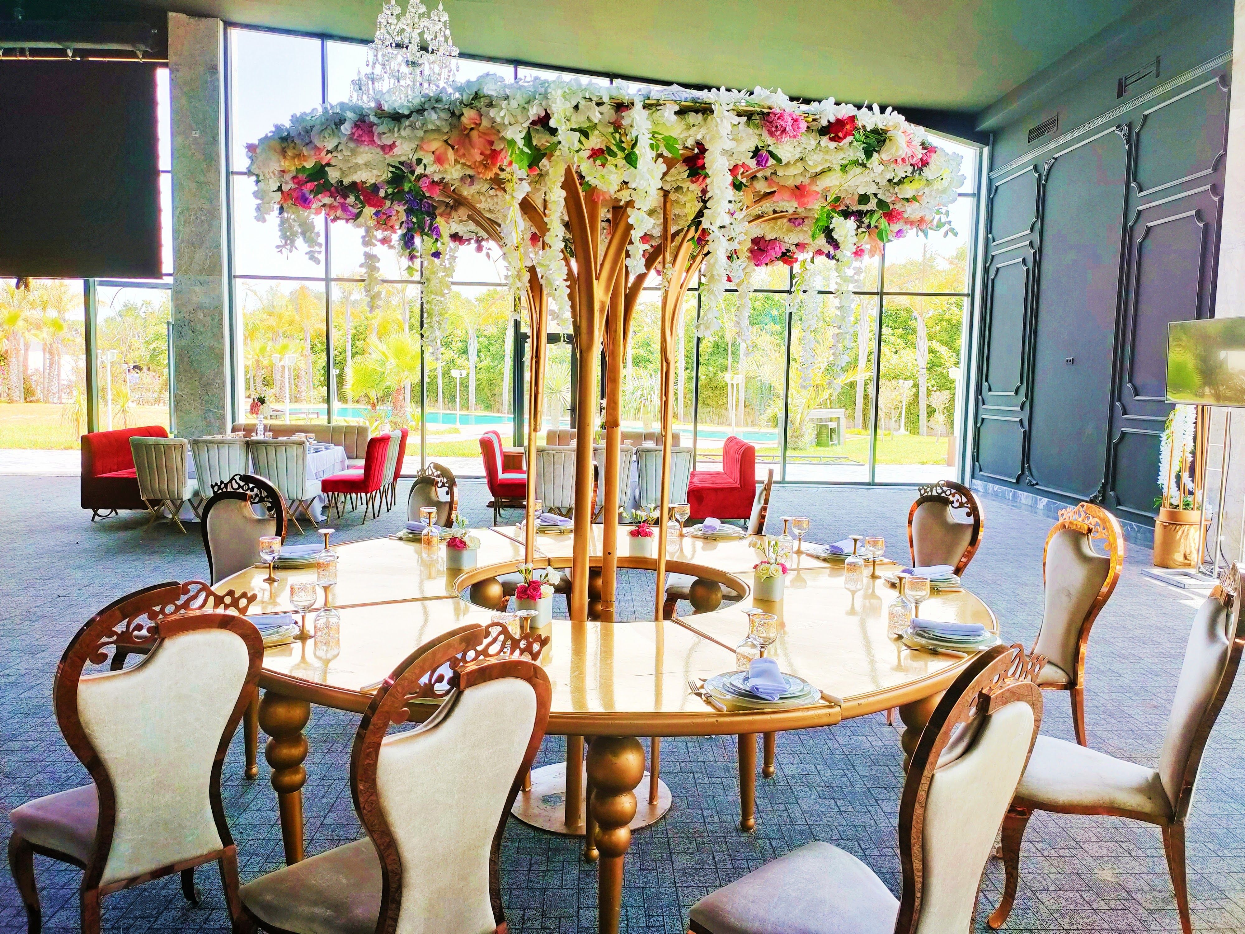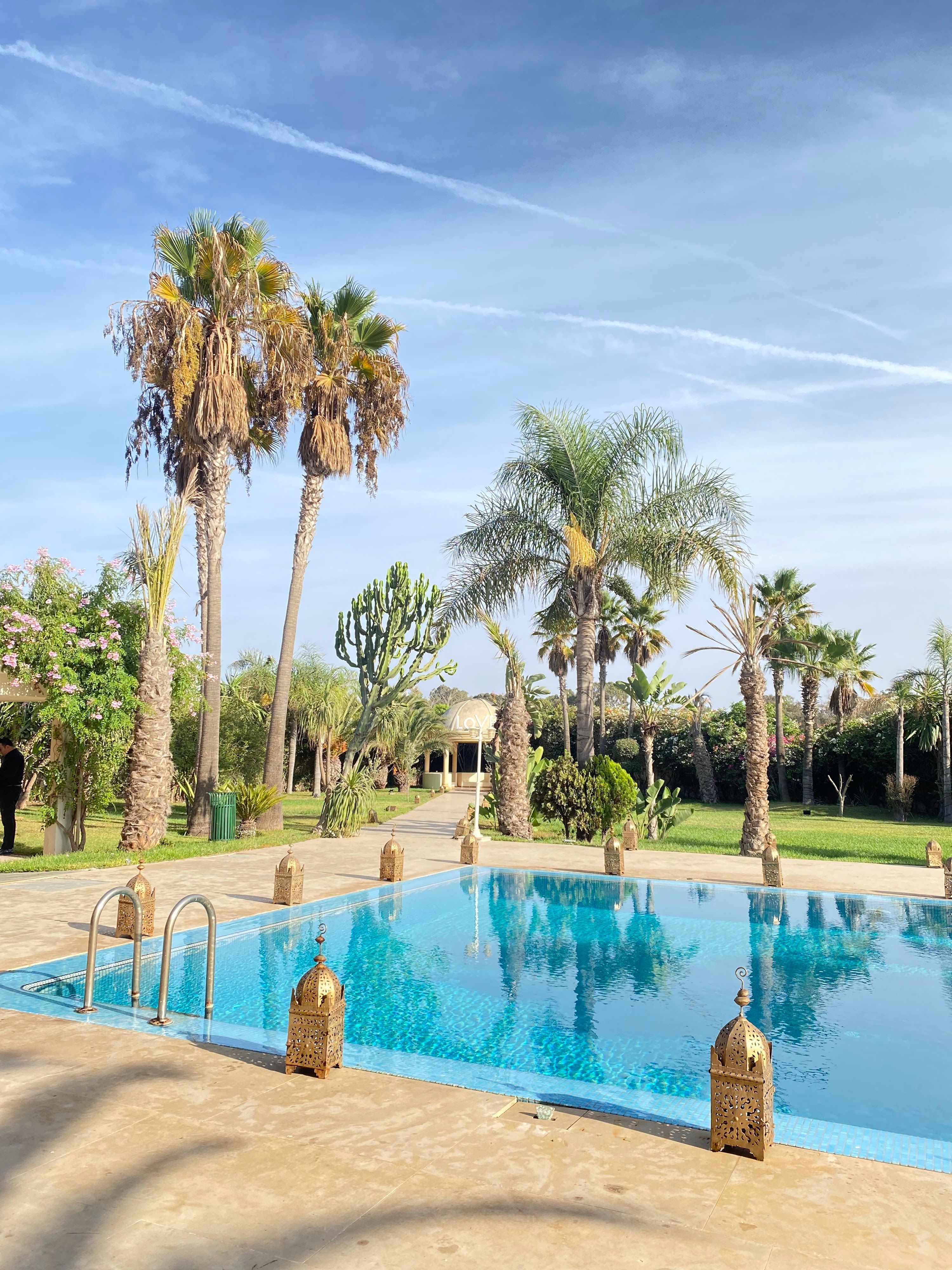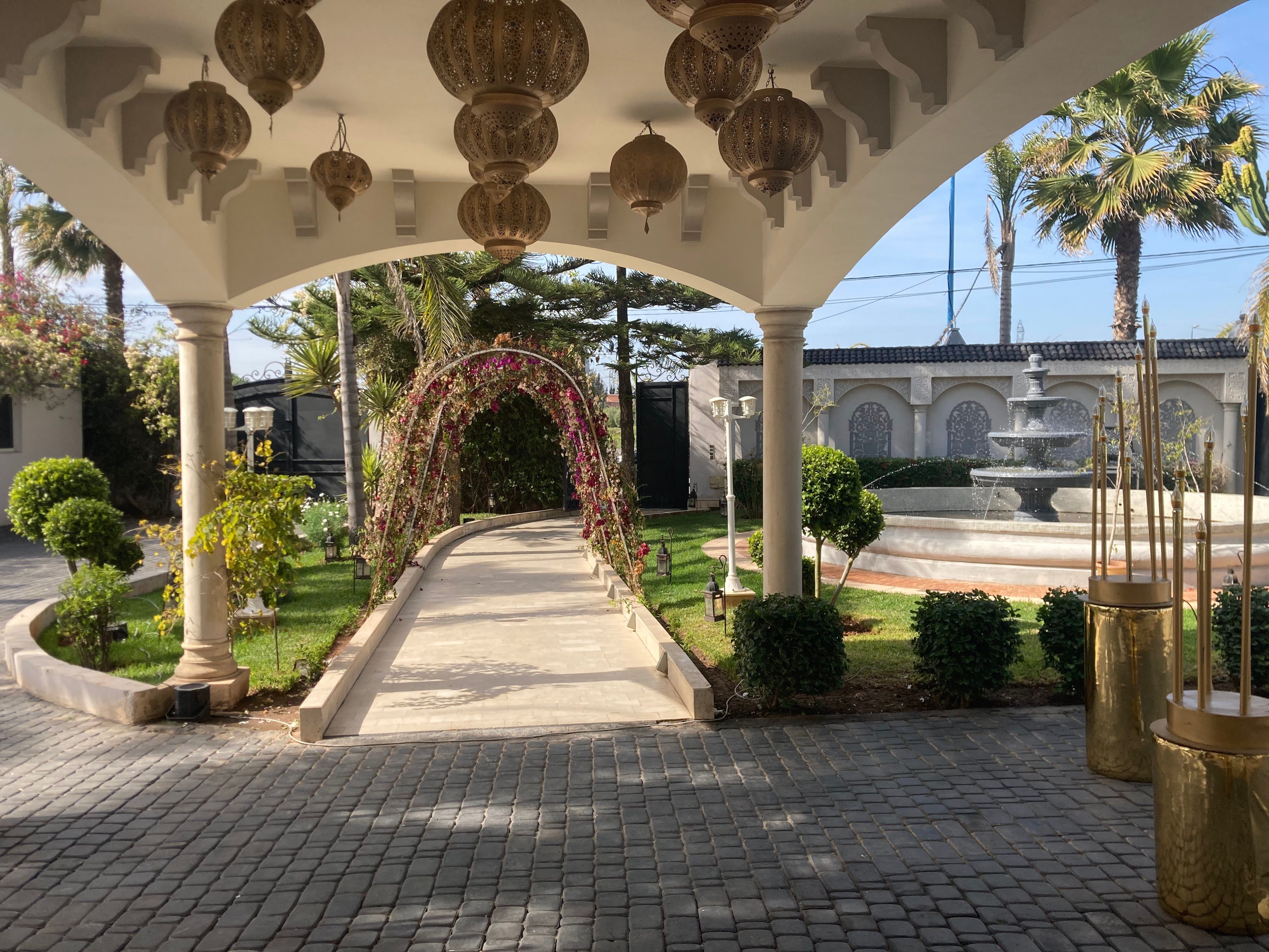 Luxurious Moroccan wedding venue in Bouskoura with spacious halls, beautiful gardens, a pool, and ample parking, perfect for weddings and events near Casablanca city center.