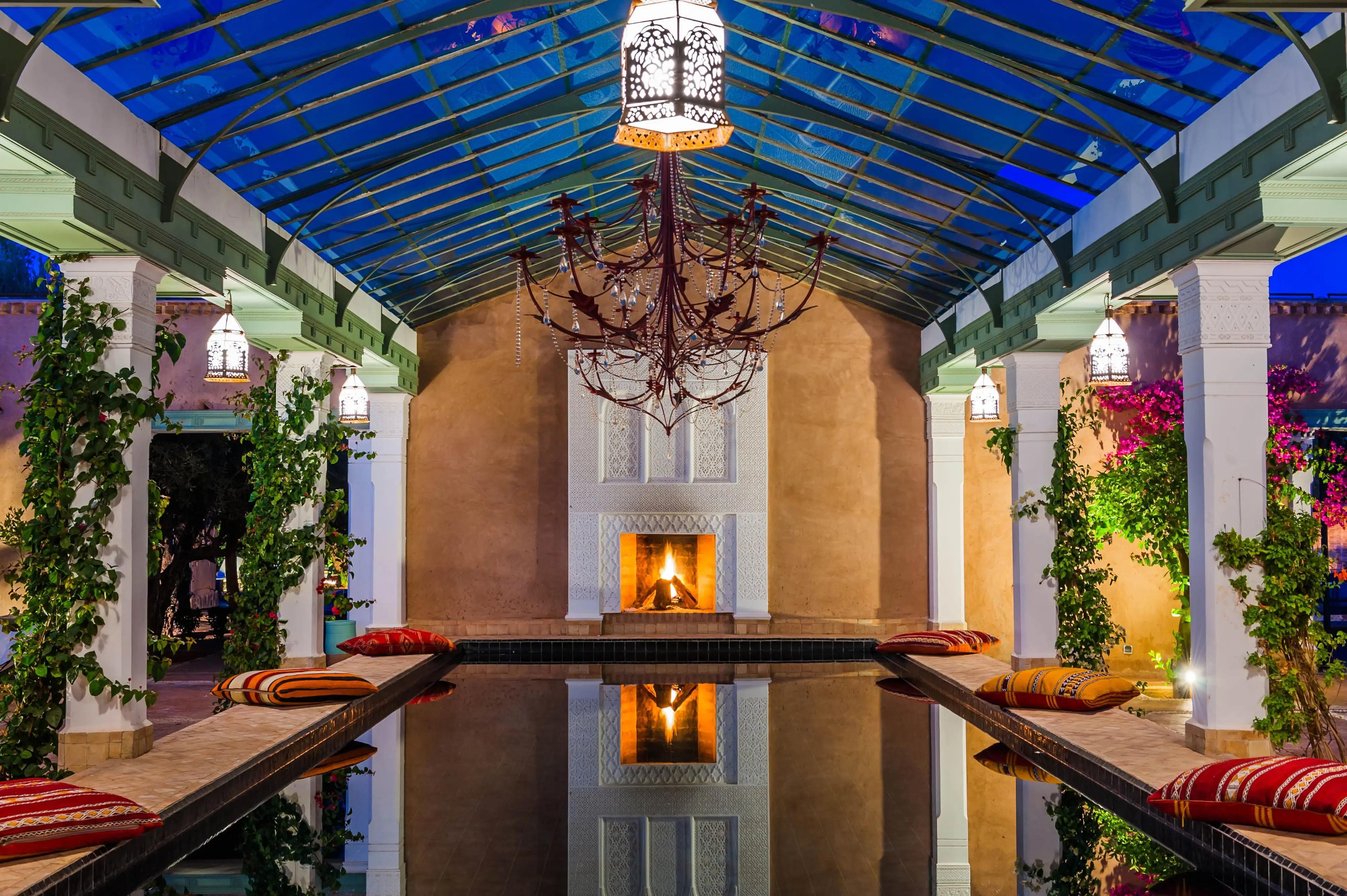 For weddings, the Beldi offers an unrivalled variety of spaces. The iconic Palm House — a soaring glasshouse cathedral flooded with natural light, tropical palms, and cascading greenery — is one of the most photographed ceremony venues in Morocco. The Orangeraie ballroom, with its spectacular glass ceiling, Moroccan lanterns, and capacity for grand banquets, creates a setting of pure enchantment for receptions. Open-air riads and courtyard terraces suit cocktail hours and intimate dinners, while the grand ksar hall accommodates live bands and dancing until the early hours. There is no venue curfew, allowing the celebration to unfold at its own natural pace.