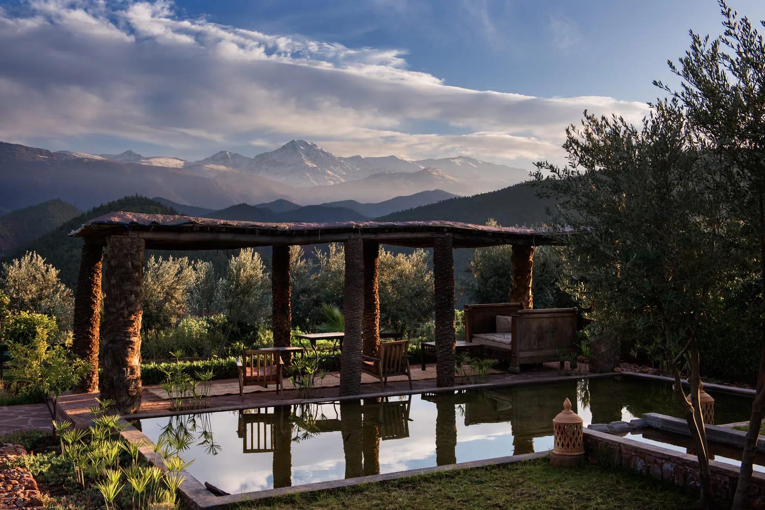 The 42 rooms — 15 in the main building, 16 in the gardens (including a 5-bedroom private villa and 3 pool suites), and 11 in the new Retreat — are each individually decorated with a unique blend of Moroccan-Berber antiques, vintage rugs, Art Deco furniture, original artworks, handmade fabrics, and curated handicrafts. Every room commands spectacular views of the Atlas Mountains, the Ourika National Park, and the valley below, where groves of olive, orange, and lemon trees line the river banks.