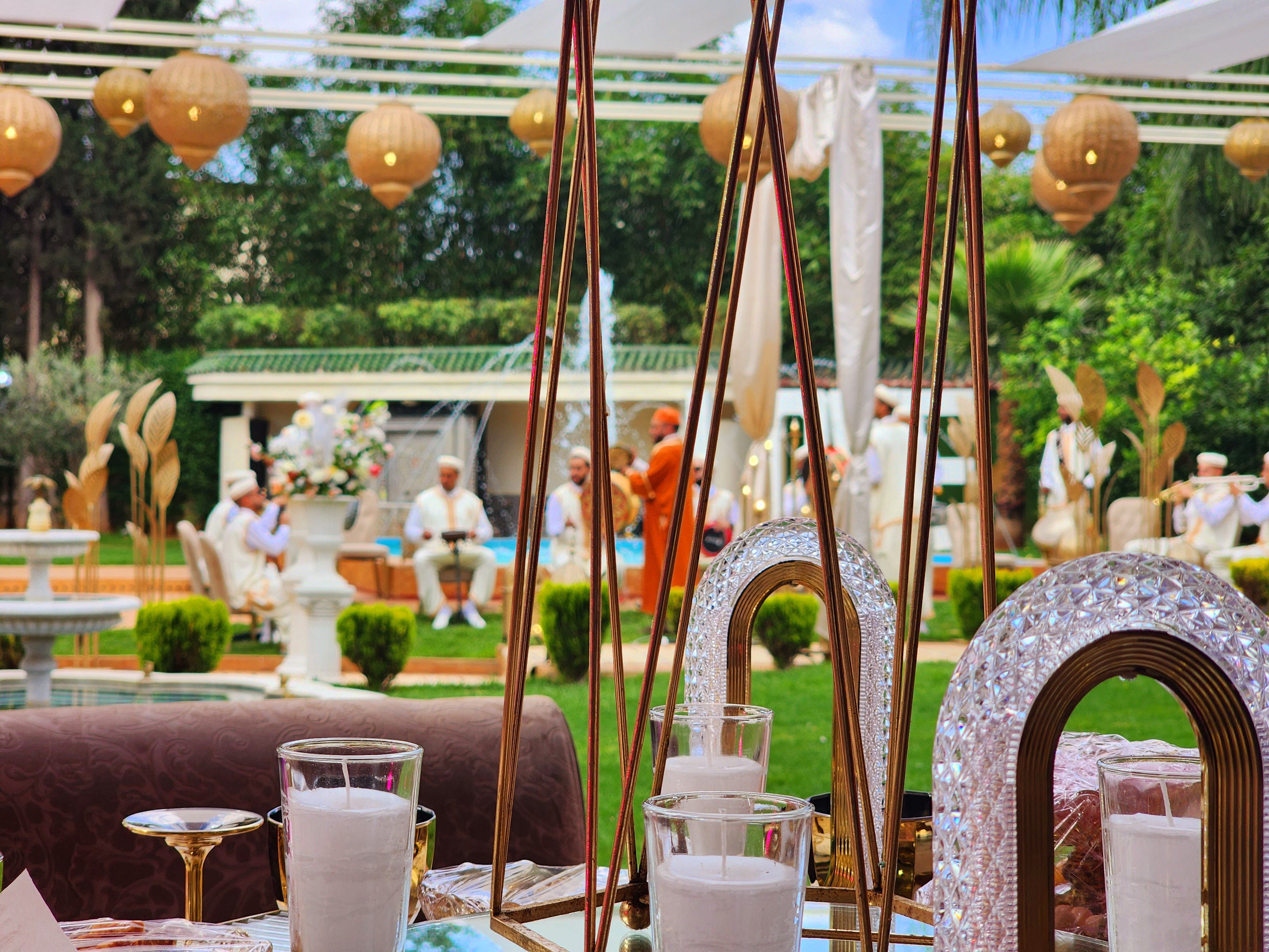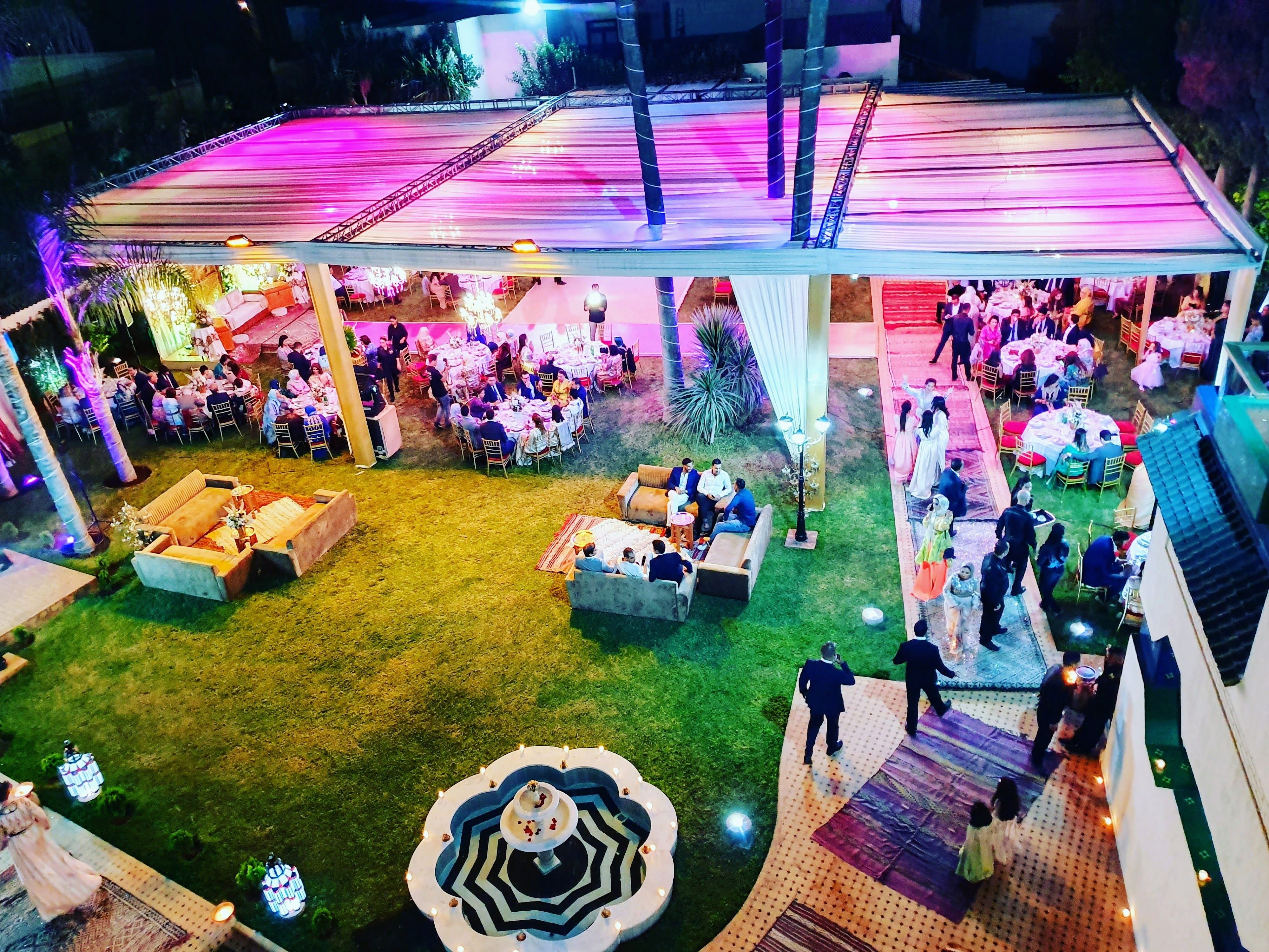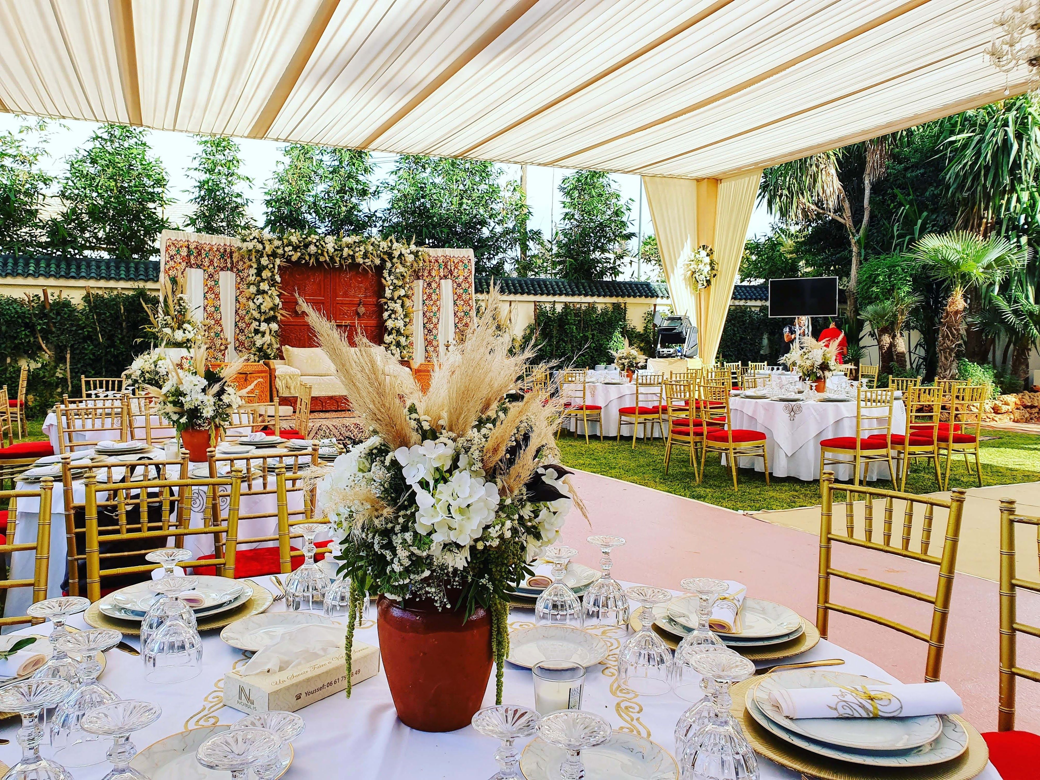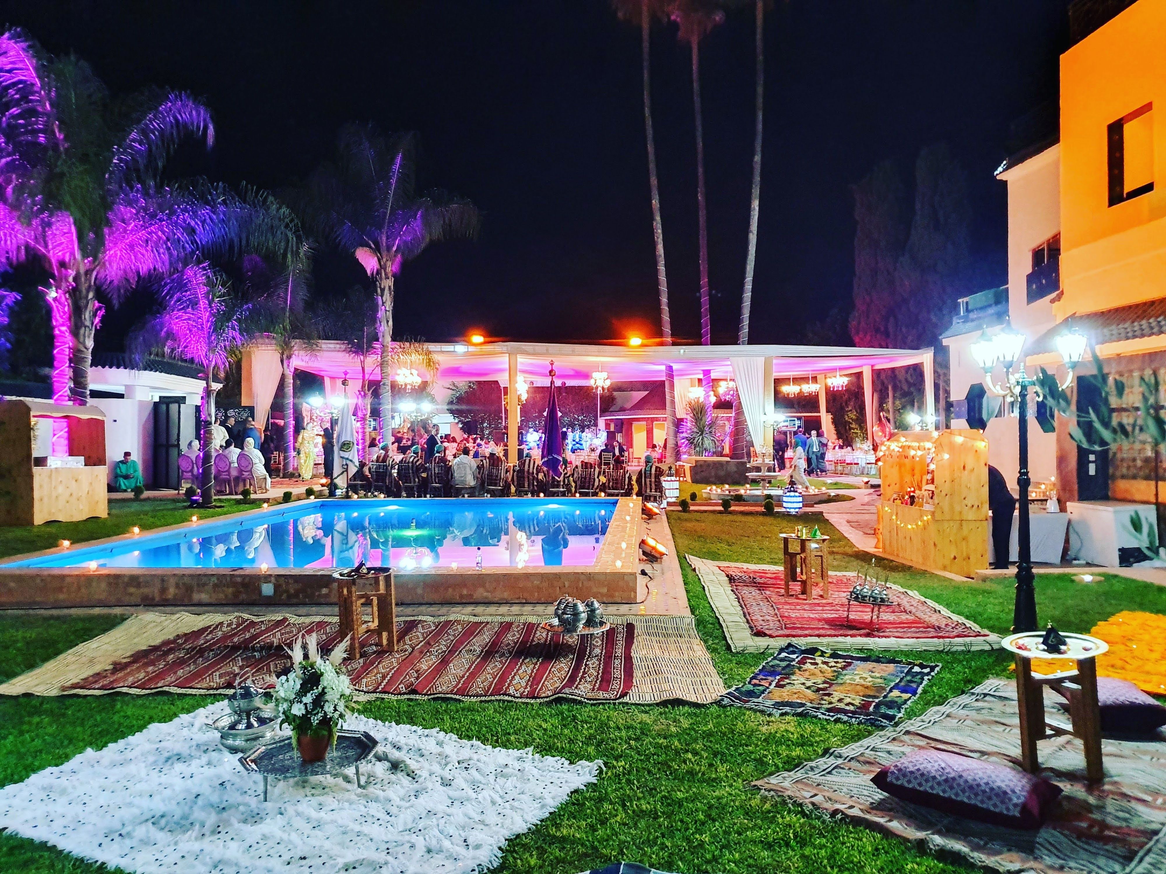 Dar Makhtara is a charming wedding villa and reception venue located in the heart of Meknes, Morocco. Designed to host elegant weddings and private celebrations, the venue combines traditional Moroccan aesthetics with modern comfort, creating a warm and welcoming atmosphere for unforgettable events. The property features a beautifully decorated indoor reception hall with traditional Moroccan design elements, offering a refined and elegant setting for wedding dinners, engagements, henna ceremonies, baptisms, birthdays, and family gatherings. The air-conditioned hall is flexible and can be customized to match the theme and style of each event. One of the highlights of Dar Makhtara is its spacious outdoor garden. Surrounded by greenery and centered around a decorative illuminated fountain, the garden creates a peaceful and romantic ambiance for open-air celebrations. The venue also includes an elegant outdoor tent area that allows events to be held comfortably outside while maintaining a stylish and protected environment. Located in a central and accessible area of Meknes, the villa provides both privacy and convenience for guests. The venue also offers parking and personalized event planning support to ensure that each celebration runs smoothly from start to finish. With space for small intimate gatherings or large receptions of up to approximately 250 guests, Dar Makhtara is an excellent choice for couples looking for a beautiful Moroccan setting for their wedding or special event.