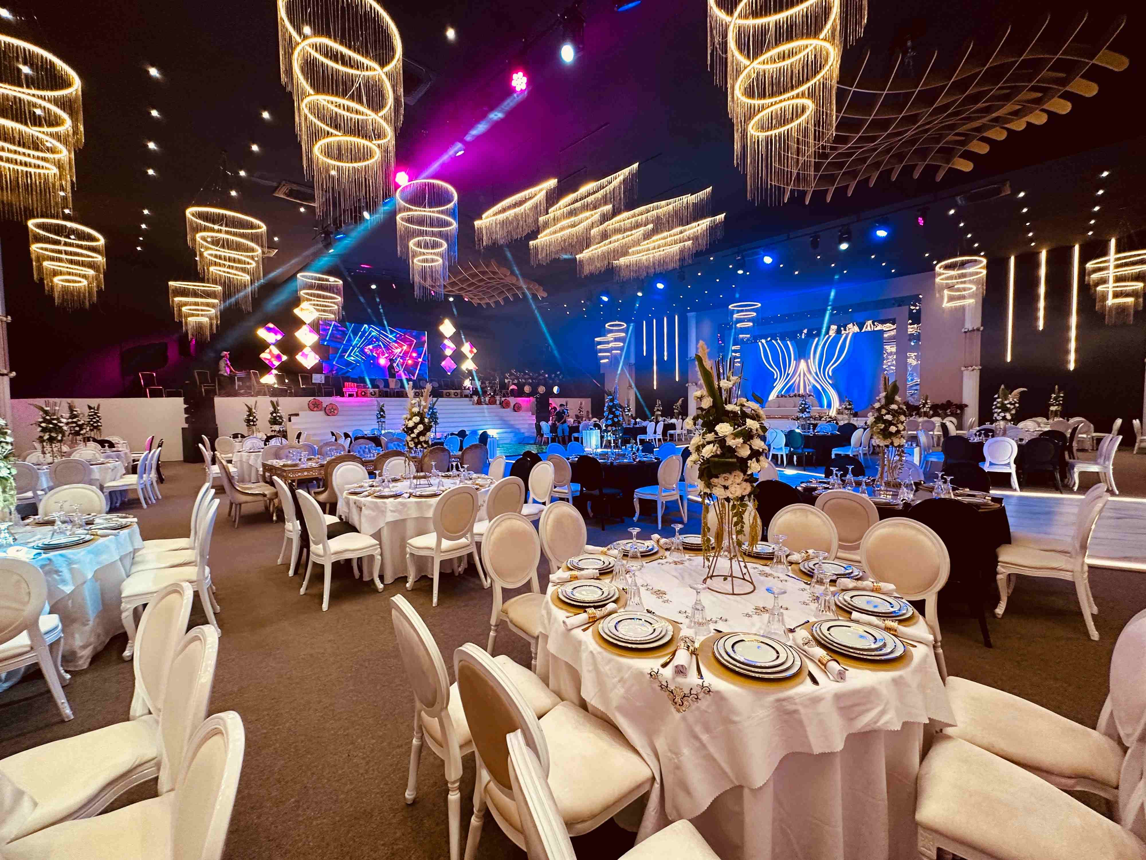 The venue features two versatile halls — a grand main hall and an intimate secondary hall — both fully air-conditioned and equipped with professional-grade audiovisual systems including video projectors, stage platforms, dance floors, round tables, and wooden chairs. The entire site can be exclusively privatized for your event, ensuring complete privacy and a truly personalized experience from the moment guests arrive to the final farewell.
